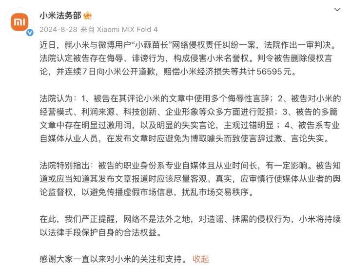 2024年8月28日,@小米法务部发文称,就小米与微博用户“小蒜苗长”网络侵权责任纠纷一案,法院作出一审判决:法院认定被告存在侮辱、诽谤行为,构成侵害小米名誉权。判令被告删除侵权言论,并连续7日向小米公开道歉,赔偿小米经济损失等共计56595元。