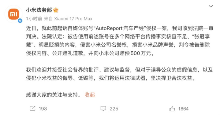 2月24日,@小米法务部在微博发文称,就此前起诉自媒体账号“AutoReport汽车产经”侵权一案,近日小米公司收到法院一审判决。